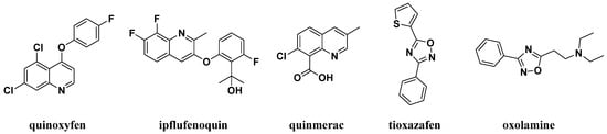 Chemical structures of quinoxyfen, ipflufenoquin, quinmerac, tioxazafen and oxolamine.