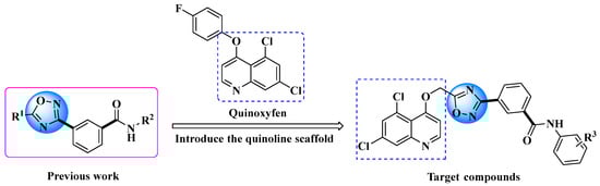 In our efforts to develop potent fungicides, we have previously reported the synthesis and biological activity studies of 1,2,4-oxadiazole-substituted benzamide derivatives [22,23]. Some of them exhibited good fungicidal activities. In view of the facts mentioned above, to further improve the fungicidal activities of these compounds, we designed (Figure 2) a series of novel 1,2,4-oxadiazole-substituted benzamides using the splicing principle of active substructures and synthesized them by introducing a quinoline scaffold at the 5-position of 1,2,4-oxadiazole. The chemical structures of these new compounds were confirmed by 1H-NMR, 13C-NMR, and HRMS, their fungicidal activities were studied and a toxicity test with zebrafish embryo was performed.