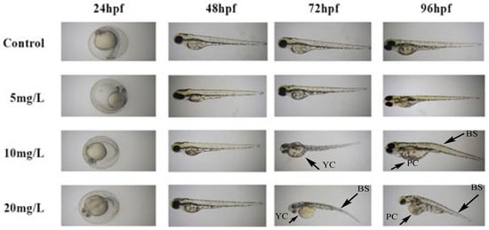 As the time and concentration increased, zebrafish embryos showed obvious developmental delay (Figure 4), such as bent spine, pericardial cyst, yolk cyst and even malformation. At 72 hpf, compared to the control group, the zebrafish embryo exposed at 10 mg/L and 20 mg/L showed obvious yolk cyst. At 96 hpf, pericardial cyst and bent spine appeared on the zebrafish embryo exposed at 10 mg/L and 20 mg/L.