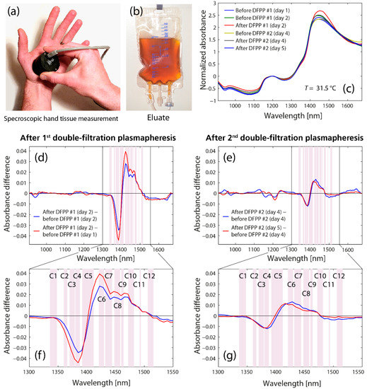 (a) Measurement performed on the palm of the left hand. (b) Bag with eluate extracted during the first DFPP treatment. The yellowish-brown color is striking, which is due to a high concentration of filtered substances. Normal blood plasma is clearer and more yellowish. (c) Raw spectra. (d) and (e) Difference spectra of the tissue measurements after the first (, ) and second (, ) DFPP treatment. (f,g) show zoomed-in regions with the 12 WAMACS. A listing of the WAMACS with the corresponding water properties can be found in Table 1 in Muncan et al. [79].