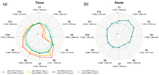 Aquagrams of the (a) tissue and (b) eluate spectra. The blue dashed circles refer to the zero baseline indicating no changes in the difference spectra. Note the complementary specific water absorbance spectral pattern of both aquagrams.