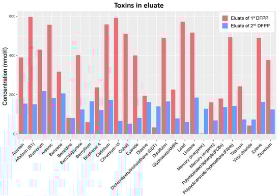 To complement the aquaphotomics-based NIR spectral analysis, the eluate obtained from both DFPP treatment was also analyzed for toxic ingredients (IGL Labor GmbH, Wittbek, Germany). The analysis revealed the presence of several toxins (Figure 4). The ten highest detected concentrations were from aflatoxin B1 (596.2 nmol/L), chromium-VI (591.0 nmol/L), lead (571.6 nmol/L), cadmium (558.1 nmol/L), arsenic (556.1 nmol/L), lindane (516.3 nmol/L), cobalt (509.5 nmol/L), polycyclic-aromatic-hydrocarbons (493.1 nmol/L), disulfoton (489.2 nmol/L) and aluminum (429.3 nmol/L). The concentration of toxins was generally significantly lower in the eluate from the second DFPP treatment compared to the first one. The concentration of some toxins increased after the second DFPP treatment (DDT, mercury, vinyl chloride), indicating that the first DFPP treatment most probably caused a diffusion gradient from the tissue to the blood, releasing these toxins from the tissue into the blood. The detoxification with DFPP is a multi-stage process whereby different compartments in the human organism are cleaned.