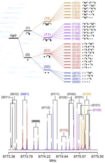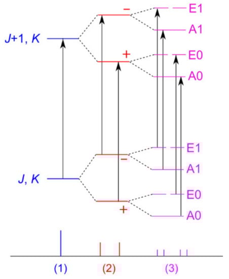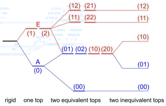 If one methyl internal rotor is involved, energy levels of each rotational state are separated into two, i.e., A and E symmetry species, as depicted in Figure 1 for the vibrational ground state v = 0. In the microwave spectrum, the observed splittings, called A–E splittings, depend on the orientation of the methyl rotor in the molecule, but also on the potential barrier hindering its torsion [12]. On the one hand, if the barrier height is infinite, we can describe the methyl internal rotation as three harmonic oscillators. Their rotational levels are degenerate and no A–E splittings exist in the spectrum. The molecules are semi-rigid rotors: Their microwave spectra can be modeled with sufficient accuracy using a rigid-rotor Hamiltonian model supplemented by centrifugal distortion corrections, as shown by a myriad of previous high-resolution rotational-spectroscopic studies in the literature. On the other hand, if the barrier vanishes, we approach the limit of free internal rotation; for example, the methyl group in CH3–C≡C–CF3 [13]. For such a molecule, all but the first energy levels are two-fold degenerate. For many intermediate cases between the free internal rotor and the harmonic oscillator, resolvable A–E splittings in the microwave spectra have been reported, and the focus is often on the molecular structures and internal dynamics. Among them, the most extensively studied molecules are those with one methyl rotor, i.e., methacrylic acid [14], methyl vinyl ketone [15], 2-butynoic acid [16], N-methylformamide [17], methyl cyanoacetate [18], methyl valerate [19], and methyl hexanoate [20]. The number of studies significantly decreases if multiple methyl internal rotors are present in the molecule. While for two-top cases we can still find some dozens of investigations, for example 3-penten-2-one [21], N-acetyl alanine methyl ester [22], and N-methylacetamide [23], only a handful of molecules featuring three methyl rotors were reported in the literature [24,25,26]. We found only one four-top molecule, 2,3,4,5-tetramethylthiophene, in an on-going study [3,27]. Multiple methyl internal rotors cause complicated spectral patterns with torsional splittings depending on the number of methyl groups and their interactions. For example, the fine structures of a two-top molecule consist of quartets if the methyl tops are equivalent, as illustrated in Figure 1 where the three torsional states of the methyl top are given as σ = 0, 1, 2. If they are not, quintets are observed, since the (01), (02) and (10), (20) levels are no longer degenerate [28].