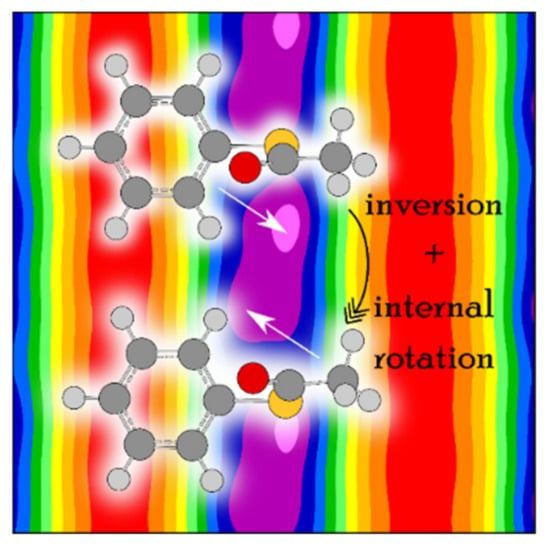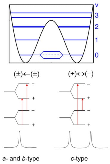 If an inversion-tunneling motion is involved in a double minimum energy potential, then the energy levels of a molecule split into (+) and (−) parity states due to a symmetric and an anti-symmetric wave function, separated by ∆E (see Figure 2) [12]. Ammonia, NH3, is the classic example to demonstrate inversion tunneling. It concerns the “umbrella” motion of the nitrogen atom through a plane spanned by three hydrogen atoms [8] connecting two energetically equivalent configurations. These two forms are separated by a potential barrier with a height on the order of 2023 cm−1, causing splittings of all rotational transitions of a certain symmetry [29]. For an asymmetric top, the selection rule is that (+)←(−) and (−)←(+) inter-state g-type transitions (g = a, b, c) occur if the direction of the μg dipole-moment component inverts upon inversion. Otherwise, the intra-state selection rule (±)←(±) applies. At zeroth order, those transitions do not split. However, small splittings, referred to as vt = 0 and vt = 1, might be found due to Coriolis interactions, if the spectral resolution allows for their observation.