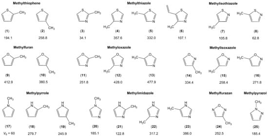 Barriers to methyl internal rotation in monomethyl-substituted planar five-membered rings (in cm−1). (1) 2-methylthiophene [96], (2) 3-methylthiophene [97], (3) 2-methylthiazole [98,99], (4) 4-methylthiazole [100], (5) 5-methylthiazole [101], (6) 4-methyl-5-vinylthiazole [102], (7) 4-methylisothiazole [103], (8) 5-methylisothiazole [104], (9) 2-methylfuran [49,105], (10) 3-methylfuran [106], (11) 2-methyloxazole [107], (12) 4-methyloxazole [107,108], (13) 5-methyloxazole [107], (14) 3-methylisoxazole [109], (15) 4-methylisoxazole [110], (16) 5-methylisoxazole [109], (17) N-methylpyrrole [111], (18) 2-methylpyrrole [112], (19) 3-methylpyrrole [113], (20) N-methylimidazole [114], (21) 2-methylimidazole [114], (22) 4-methylimidazole [114], (23) 5-methylimidazole [114], (24) methyl furazan [115], (25) N-methylpyrazole [116].