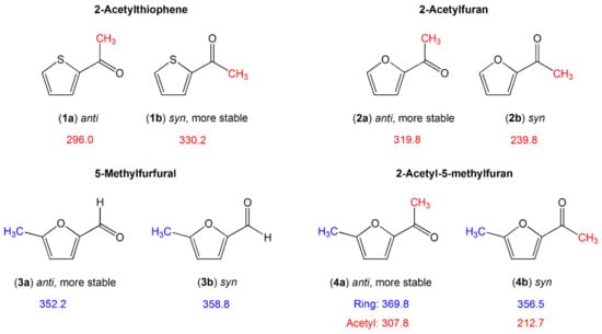 Barriers to methyl internal rotation in furan and thiophene derivatives with a carbonyl-group-containing substituent (in cm−1). (1) 2-Acetylthiophene [132], (2) 2-acetylfuran [133], (3) 5-methyl furfural [134], (4) 2-acetyl-5-methylfurfural [86].