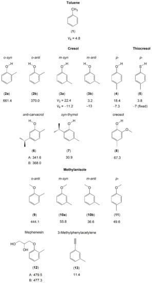 Barriers to methyl internal rotation in toluene and cresol derivatives (in cm−1). (1) The prototype toluene [137,138,139,140,141,142], (2) o-cresol [143], (3) m-cresol [144], (4) p-cresol [145], (5) p-thiocresol [146], (6) anti-carvacrol (two conformers, A and B) [147], (7) syn-thymol [147], (8) creosol [148], (9) o-methyl anisole [127], (10) m-methyl anisole [149,150], (11) p-methylanisole [151], (12) mephenesin (two conformers, A and B) [152], (13) 3-methylphenylacetylene [153].