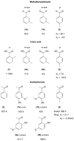 Similar to the case of aromatic five-membered rings, several six-membered rings containing a carbonyl group that extends the conjugated π-double-bond system were systematically investigated by microwave spectroscopy. The representatives are methyl benzaldehyde, toluic acid, acetophenone and its derivatives. Figure 6 summarizes their experimental methyl torsional barriers.
