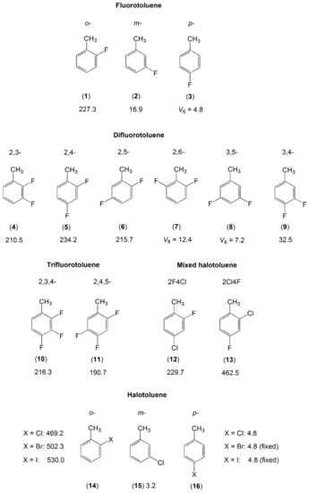 The fluoro-substituted toluene derivatives form a large body with many previous investigations, for example the fluorotoluene family with its three isomers [161,162,163,164], the difluorotoluenes with six isomers [165,166,167,168,169], and trifluorotoluenes with two isomers [170] are reported in the literature. The number of investigations on chloro-substituted toluenes is smaller and limited to the three isomers ortho- [128], meta- [171], and para-chlorotoluene [172] and the two mixed halogen-substituted toluenes, 2-fluoro-4-chlorotoluene [129] and 2-chloro-4-fluorotoluene [130]. For the o- and p-isomers, studies on bromo- and iodotoluene also exist [128,172]. The molecules are illustrated in Figure 7.