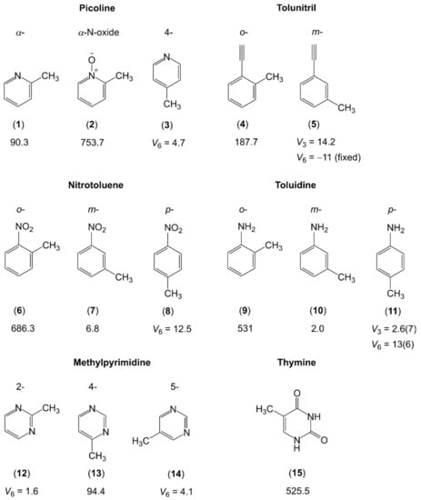 Barriers to methyl internal rotation in nitrogen-containing aromatic six-membered ring (in cm−1). (1) α-picoline [173,174], (2) α-picoline-N-oxide [175], (3) 4-picoline [176], (4) o-tolunitril [177,178], (5) m-tolunitril [179], (6) o-nitrotoluene [180], (7) m-nitrotoluene [181], (8) p-nitrotoluene [180], (9) o-toluidine [182], (10) m-toluidine [182], (11) p-toluidine [183], (12) 2-methylpyrimidine [184], (13) 4-methylpyrimidine [185], (14) 5-methylpyrimidine [186], (15) thymine [187].