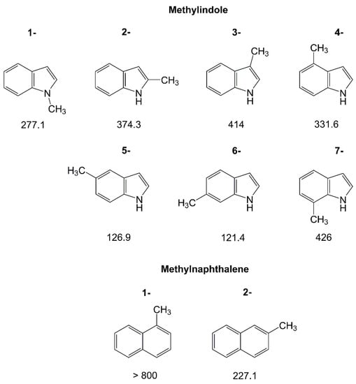Due to the low vapor pressure, the number of studied aromatic rings larger than six-membered with methyl internal rotation is very limited. Currently, there are only investigations of methylnaphthalenes [131] and the seven isomers of methylindole [188], visualized in Figure 9. In such large rings, the torsional barrier of the methyl top reflects well the electronic environment around the perimeter of the ring. Regarding the methylindoles, e.g., the lowest barriers are found for the 5- and 6-isomers, which are very similar (126.9 cm−1 and 121.4 cm−1, respectively). The two methyl groups experience almost the same steric and electronic surroundings from their positions attached to the ring. The highest barriers are those of the 3- and the 7-isomers. With values of 414 cm−1 and 426 cm−1, respectively, they are also very similar, though the two methyl groups are attached to different parts of the indole ring. Note that both methyl groups are separated, while still electronically connected through the π-system, by two carbon atoms from the nitrogen atom. The intermediate barrier heights of 374.3 cm−1 and 331.6 cm−1 of 2-methylindole and 4-methylindole, respectively, lay in between. 1-methylindole distinguishes itself from the other isomers in the family from the methyl substitution at the nitrogen atom, with its intermediate torsional barrier of 277.1 cm−1. Gurusinghe and Tubergen associated this value to the 0.05 Å shortened rotor length due to the higher electronegativity of the nitrogen atom, but also to two localized molecular-orbital single bonds in its vicinity with the largest contributions being nonlocal-bonding–anti-bonding interactions of two localized molecular-orbital C–C bonds on either side of to the rotor [188].
