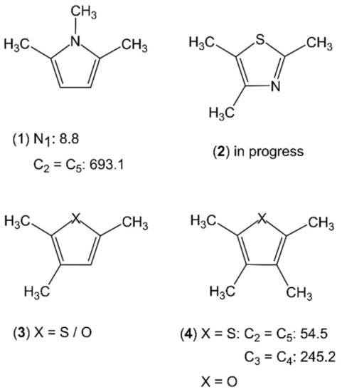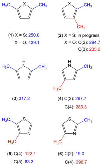 Only four dimethyl-substituted planar five-member rings, 4,5-dimethylthiazole [85], 2,5-dimethylpyrrole [87], 2,5-dimethylfuran [88], and 2,5-dimethylthiophene [89], are published in the literature. Studies in progress include the 2,3-isomers of dimethylfuran [190] and dimethylthiophene as well as the 2,4-isomers of dimethylpyrrole [191] and dimethylthiazole [192]. Figure 10 provides an overview of this class of molecules. With these few data points, it is not possible to draw a trend of the methyl torsional barriers. We observed for the methyl group at the 2-position of 2,4-dimethylthiazole (6) an unexpectedly low barrier of 19.1 cm−1 [192], the same situation as that of 2-methylthiazole (molecule (3) in Figure 3) [98,99]. Though slightly higher, the values of 122.1 cm−1 and 63.3 cm−1 found for the 4- and the 5-methyl groups, respectively, of 4,5-dimethylthiazole (5) [85] are still too low to be explained by steric effects, especially if compared to the intermediate value of 396.7 observed for the 4-methyl group of the 2,4-isomer (6), as well as those of the dimethylfurane (1, 2) [88,190], dimethylthiophene (1, 2) [89], and dimethyl-pyrrole (3, 4) [87,191] families. This again hints at electronic effects as the reason.