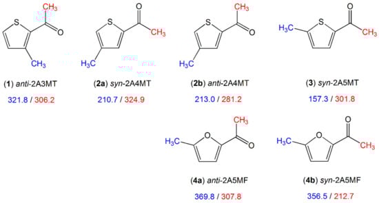 The torsional barrier of the acetyl methyl rotor is also affected by the ring methyl group. Starting with the values of 296.0 cm−1 for anti- (1) and 330.2 cm−1 for syn-2-acetylthiophene (2) (see Figure 12), adding a methyl group at the 4- (2-acetyl-4-methylthiophene, (6)) or the 5-position (2-acetyl-5-methylthiophene, (7)) of the thiophene ring decreases the barrier, but adding the methyl group at the 3-position (2-acetyl-3-methylthiophene, (5)) increases it. This can again be explained by the so-called chain-length effect reported for linear aliphatic ketones containing an acetyl group [135]. Ketones with longer chains feature more prolate character and the acetyl methyl groups possess lower torsional barriers. The effect is reported to be stronger for linear aliphatic ketones with a Cs structure and thus a “straighter” chain than those with a C1 structure and a “bent” chain.