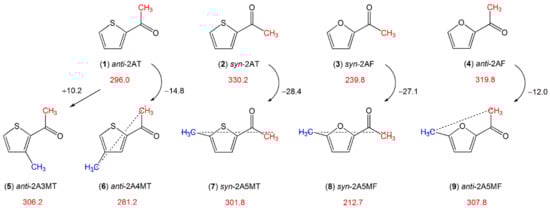 We found the same situation while comparing the molecules in Figure 12. In anti-2-acetyl-4-methylthiophene (6) [194] (−14.8 cm−1 compared to anti-2-acetylthiophene (1) [132]), syn-2-acetyl-5-methylthiophene (7) [195] (−28.4 cm−1 compared to syn-2-acetylthiophene (2) [132]), syn-2-acetyl-5-methylfuran (8) [86] (−27.1 cm−1 compared to syn-2-acetylfuran (3) [133]), the acetyl methyl and ring methyl group lie on a straight chain (marked by a dotted line in Figure 12), and the torsional barrier of the acetyl methyl rotor decreases more than it does for anti-2-acetyl-5-methylfuran (9) (−12.0 cm−1 compared to anti-2-acetylfuran (4)). In anti-2-acetyl-3-methylthiophene (5) [193], the additional methyl group at the 3-position of the ring makes the molecule more globular than anti-2-acetylthiophene (1). Therefore, the barrier hindering the acetyl methyl torsion increases.