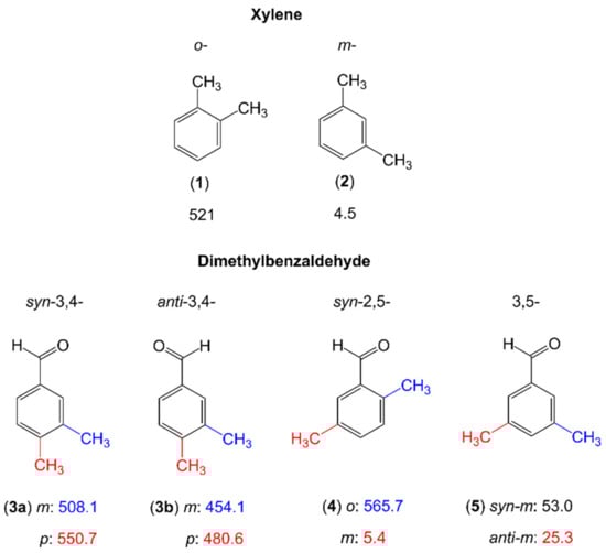 In only a few cases reported in the literature, such as the three isomers of dimethylbenzaldehyde [81] and two isomers of xylene (o- and m-) [196,197], the methyl rotors are attached to a phenyl ring (see Figure 13). We recognize a clear trend that the barrier height is extremely low (around 5 cm−1) for the meta methyl groups of m-xylene (2) [197] and syn-2,5-dimethylbenzaldehyde (4) [81] due to the absence of steric hinderance. While still being very low, the values found for the two meta methyl groups of 3,5-dimethylbenzaldehyde (5) [81] are an order of magnitude larger. This demonstrates again that not only steric hindrance, but also the electronic environment plays an important role in the methyl torsions. In o-xylene (1), the 3,4-isomer (3) as well as the o-methyl group of the 2,5-isomer (4) of dimethylbenzaldehyde, the methyl internal rotation barriers are intermediate, ranging from about 450 cm−1 to about 560 cm−1, attributed to steric reason. Currently, several studies are focusing on two dimethylbenzene families, dimethylanisole and dimethylfluorobenzene, aiming at studying a complete series of molecules in order to understand the methyl torsions around the ring perimeter.
