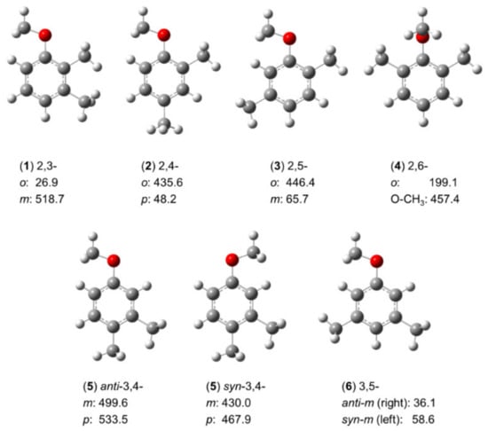 Torsional barriers of the methyl rotors in six isomers of dimethylanisole (in cm−1). (1) 2,3-dimethylanisole [84], (2) 2,4-dimethylanisole [82], (3) 2,5-dimethylanisole [198], (4) 2,6-dimethylanisole [198,199], (5) 3,4-dimethylanisole [83], and (6) 3,5-dimethylanisole [198].