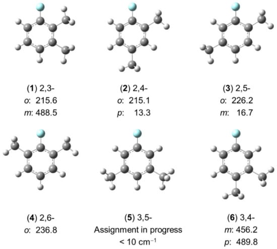 In the studies shown in Section 2.2.2.1 on the isomers of dimethylanisole, only for 3,4- and 2,6-dimethylanisole, in which the barriers to internal rotation of the methyl groups are intermediate, no fitting problems were encountered [83,198,199]. In the other cases, there is an argument that the vibration of the methoxy methyl group out of the Cs symmetry plane formed by the phenyl group cannot be neglected, and thus the Hamiltonian model has to account for it in order to accurately reproduce the rotational spectra. Since no splittings which might potentially arise from this effect were observed, the methoxy methyl group was substituted by a fluorine atom, and six isomers of dimethylfluorobenzene (shown in Figure 15) were studied to conclude whether the vibration of the methoxy methyl group is negligible or not.