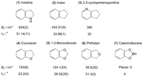 - Caminati, W.; Damiani, D.; Corbelli, G.; Favero, L.B. Ring Puckering Motion in Indan: A Microwave Spectroscopy Study. Mol. Phys. 1992, 75, 857–865. [Google Scholar] [CrossRef]