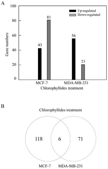 Comparisons of differentially expressed genes (DEGs) from MCF-7 and MDA-MD-231. (A) Upregulation and downregulation of DEGs in MCF-7 and MDA-MD-231 cells with chlorophyllides treatments. (B) Venn diagram of the overlapped DEGs between chlorophyllides-treated MCF-7 and MDA-MB-231 cells. The MCF-7 and MDA-MB-231 cells shared six genes of DEGs.