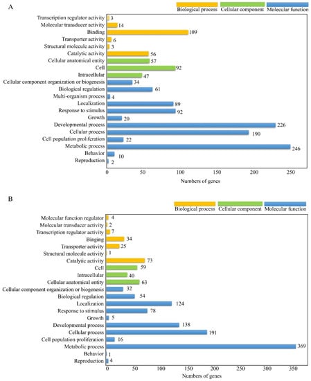 Functional distribution of GO annotation extracted from chlorophyllides composites treatments. (A) MCF-7 cells with chlorophyllides composites treatments. (B) MDA-MB-231 cells with chlorophyllides composites treatments. The results of GO enrichment analysis of DEGs were classified into three categories: molecular functions, cellular component and biological process. The y-axis is gene functional classification of GO, while x-axis is the corresponding number of genes.