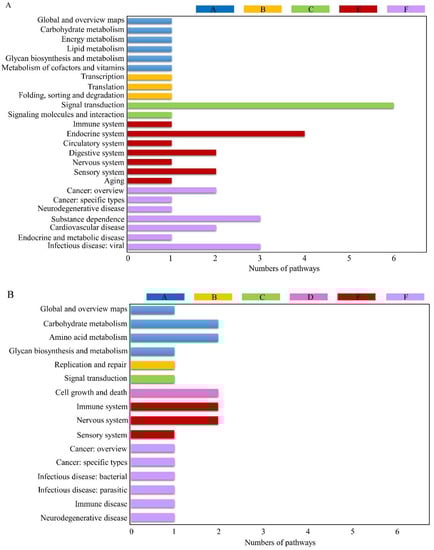 KEGG (Kyoto Encyclopedia of Genes and Genomes) assembled unigenes from chlorophyllides composites treatments. (A) MCF-7 cells; (B) MDA-MB-231 cells. The results were classified into six categories: A. metabolism; B. genetic information processing; C. environmental information processing; D. cellular processes; E. organismal systems; and F. human diseases. The y-axis is classification of KEGG, and the x-axis is the corresponding numbers of pathways. p < 0.5.