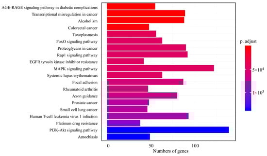 To further identify the chlorophyllides composites relevant KEGG pathways that were common in both breast cancer cell lines, we compared the KEGG pathways that were enriched in chlorophyllides composites-treated MCF-7 and MDA-MB-231 cells (Figure 4). The top 20 common KEGG pathways were shown, including the PI3K-Akt signaling pathway, MAPK pathway, Rap1 signaling pathway or human T-cell leukemia virus 1 infection. In this study, we focused more on the underlying pathways that are related to cancer or drug resistance. Hence, the differential expression involved in cancer or drug resistance was compared between MCF-7 and MDA-MB-231 cells (Table 2 and Table 3). The results revealed that 23 and 4 significantly enriched KEGG pathways related to cancer and drug resistance were identified, respectively. We observed that 90, 89 and 74 DEGs were mapped to “proteoglycans in cancer” (hsa05205), “transcriptional misregulation in cancer” (hsa05202) and “viral carcinogenesis” (hsa05203) pathways (Table 2). For the chlorophyllides composites relevant pathways in drug resistance, there were 15, 38, 42 and 45 DEGs related to “antifolate resistance” (hsa01523), “platinum drug resistance” (hsa01524), “EGFR tyrosine kinase inhibitor resistance” (hsa01521) and “endocrine resistance” (hsa01522) pathways (Table 3).