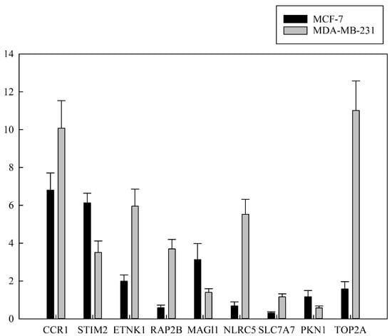 The genes mentioned below were identified and mapped to the KEGG database, and their association was observed (Table 4). It has been reported that the natural products from plant sources have various biological activities, such as anti-oxidation, anti-inflammation or anti-proliferation [5]. Many of the reported anti-cancer effects of natural compounds also target cellular proteins that play important roles in signal transduction, apoptosis or cell cycle arrest [52]. By the bioinformatics analysis, we found that many DEGs were enriched in signaling and cellular process, such as CCR1, STIM2, ETNK1, RAP2B, MAGI1, NLRC5, SLC7A7, PKN1 and TOP2A. Previously, we have demonstrated that purified chlorophyllides composites could be a potential candidate for combination therapy to breast cancers with multiple drug resistance [38]. Therefore, we focused on several interesting factors that were differentially affected by chlorophyllides composites treatment in MCF-7 and MDA-MB-231 cells. CCR1 expression was upregulated in both MCF-7 and MDA-MB-231 cells. CCR1 belonged to the G protein-linked receptor superfamily. The expression of CCR1 has been reported on tumor cells, peripheral blood cells, immune cells and stromal cells. After the binding of CC chemokine (e.g., CCL14, CCL15, CCL16), CCR1 exhibited important roles in tumor invasion and metastasis in several cancers [53,54,55,56,57]. STIM2 was upregulated in both MCF-7 and MDA-MB-231 cells, and the FC in both cells was in accordance with RT-qPCR and microarray data. STIM2 is an endoplasmic reticulum-associated Ca2+-sensing protein that responded to endoplasmic reticulum Ca2+ store depletion and transduced this cellular signal to Orai1 channel proteins [58,59]. Previous studies have demonstrated that disturbance of STIM is associated with the pathogenesis of several diseases, such as autoimmune disorders, cancer, cardiovascular disease, ageing, Alzheimer’s and Huntington’s diseases [60,61,62]. ETNK1 expression was upregulated in both MCF-7 and MDA-MB-231 cells. ETNK1 is an ethanolamine-specific kinase that catalyzes the phosphorylation of ethanolamine to generate phosphoethanolamine, which is the first step for biosynthesis of phosphatidylethanolamine. Previous studies have reported that mutations of ETNK1 may play important roles in oncogenesis [63,64]. RAP2B is a member of the Ras oncogene family that was upregulated by chlorophyllides composites in MDA-MB-231 cells. As signaling effectors of GTPase-binding protein Rap, Rap2B mediated various biological functions, including regulating the p53-mediated pro-survival function, and binding phospholipase C-ε and interferon-γ that promote the development of tumors [65].