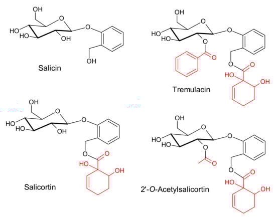 - Boeckler, G.A.; Gershenzon, J.; Unsicker, S.B. Phenolic glycosides of the Salicaceae and their role as anti-herbivore defenses. Phytochemistry 2011, 72, 1497–1509. [Google Scholar] [CrossRef] [PubMed]