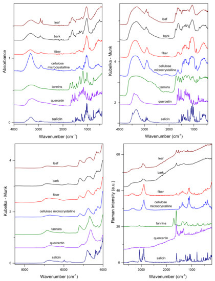 Near-infrared spectroscopy is the most frequently used vibrational technique in plant material analysis. Transmittance and reflectance near-infrared (NIR) spectra were utilized to study the physicochemical properties of foliage samples, including the determination of different organic constituents; chlorophyll and carotenoid contents; and elemental analyses of carbon, nitrogen, and phosphorus, as well as the 13C and 15N levels [14,15,16,17,18]. NIR spectroscopy was applied to analyze the phenolic compounds and alkaloids in green tea leaves, flavonoids in rice grains, and tannins in greater lotus samples [19,20,21,22]. Changes in the chemical compositions of plant materials detected by the NIR technique enabled field phenotyping of the leaf samples and the classification of wood and bark samples [23,24]. In the case of poplar material analysis, NIR data were used to quantify tannins and phenolic glycosides in leaf samples [5]. Furthermore, research has reported an application of this technique for salicinoids determination in the fresh and dry leaves of aspen and paper birch [25].