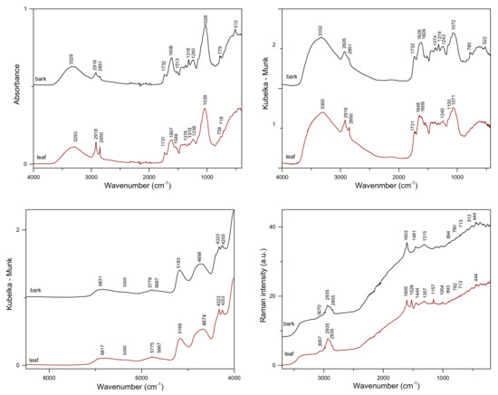 Vibrational spectra of poplar bark and leaves: top panel—ATR (left) and DRIFTS (right) and bottom panel—NIR (left) and Raman (right).