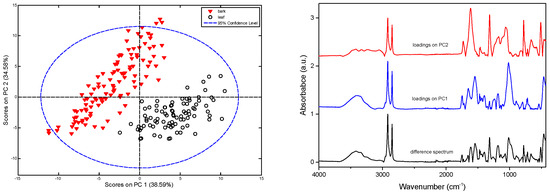 PCA for ATR spectra of poplar bark and leaves for merged data sets: left—score plots and right—plots of the absolute values of the PC1 and PC2 loadings and subtraction result between the average leaf and bark spectra.