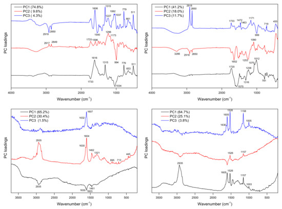 Figure 6 shows the obtained PCA loadings for ATR and Raman data, while these plots for DRIFTS and NIR data are presented in Figure S2 in the Supplementary Materials. These plots distinguish spectral variations originating from structurally related substances.
