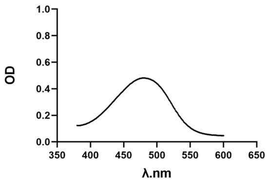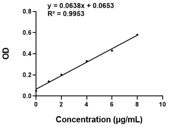 The ultraviolet spectrum of AST with a certain concentration was scanned by a multifunction microplate detector, and the maximum absorption wavelength of AST at 480 nm was determined (Figure 1). After fitting the absorbance of AST at different concentrations at 480 nm, the linear regression equation of AST was y = 0.0638x + 0.0653 (Figure 2), which was linear for 0–10 μg/mL.