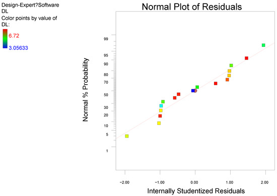 The model F-value of 469.54 and p-value less than 0.0001 imply that the model is significant. The lack of fit F-value of 1.56 implies that the lack of fit is insignificant, and the normal plot of residuals (Figure 3) may imply that the model fit is good. The results for the DL of AST@PLGA can be predicted and analyzed. The results in Table 7 indicate that the order of the three influencing factors on the DL of AST@PLGA is A > C > B, thereby suggesting that the proportions of drug and carrier have the greatest influence, followed by ultrasonic time and the ratio of oil to water.