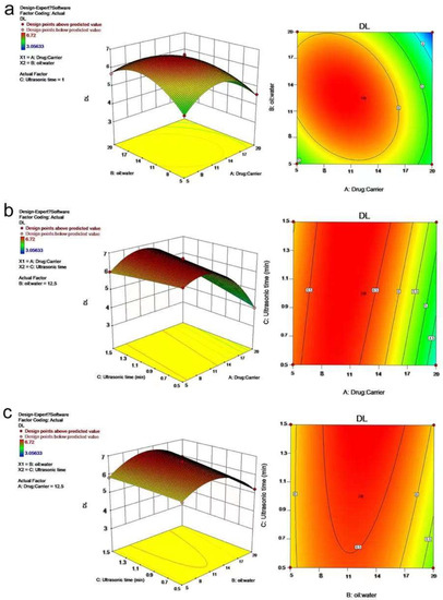 The single-factor screening experiments that may affect the DL in the preparation process, including the ratios of drug to carrier and oil phase to water phase, the concentration of PVA, ultrasonic power, and ultrasonic time were conducted. Depending on the single-factor screening experiments, we selected the three factors that have the greatest influence on DL. RSM was adopted in the experimental design. The experiment was performed with three factors and three levels, including 17 runs, and DESIGN-EXPERT 10 software was used for the optimization study.