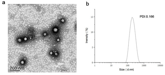 Imaging analysis of particle morphology is an important index to characterize nanomaterials. Commonly used methods include TEM, SEM, and so on. The morphology of the nanoparticles affects the circulation, distribution, cell uptake, and release of drugs in vivo. As shown in Figure 5, the shape of AST@PLGA@BEVEV was spherical, regular, and evenly distributed. The outermost layer is the EV of broccoli, and the inner layer is AST@PLGA. Similar to the results in the currently reported TEM images, it is generally considered that PEV is similar to EV from animals and is quasi-spherical. The outer BEVs are spherical, which is consistent with the results of the current research [33]. AST is an irregular, massive crystal, which more easily enters into the cell after being encapsulated [34]. The size and PDI of nanoparticles are very important characteristics and may affect the toxicity, stability, and biological distribution of the drug delivery [35]. The significance of the zeta potential is that its value is related to stability. The zeta potential is proof of the strength of the mutual repulsion or attraction among the particles. The smaller dispersed particles indicate higher absolute values for the zeta potential and more stable systems [36]. The size of AST@PLGA@BEVs is 191.60 ± 2.23 nm, PDI is 0.166, and the zeta potential is −15.85 ± 0.92 mV. This finding proved that the AST@PLGA@BEVs are uniformly dispersed, stable in aqueous solution, and easier to be absorbed.