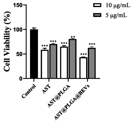 The anticancer activity in vitro of AST, AST@PLGA, and AST@PLGA@BEVs in HT-29 cells was evaluated using the MTT assay (Figure 6). After HT-29 cells were treated with different concentrations of the three drugs for 24 h, the proliferation of HT-29 cells was inhibited to different degrees, and the inhibitory effect of the same was dependent on concentration. At the same concentration, the cell viability of 10 and 5 μg/mL AST@PLGA@BEVs was 43.29% and 62.41%, respectively. Comparing AST and AST@PLGA, AST changed the cell viability to 58.51% and 70.25%, respectively; AST@PLGA changed the cell viability to 64.90% and 80.45%, respectively; and AST@PLGA@BEV possesses increased anticancer activity. Studies have shown that AST can inhibit the growth of cancer cells by blocking cell cycle progression and promoting apoptosis [37]. The BEVs have anticancer activity and can promote tumor cell apoptosis by specifically targeting the tumor site [38]. PLGA has good biocompatibility and degradability in physiological environments, but PLGA may not enhance the biological activity of AST due to the drug release rate for 24 h. EV extracted from edible plant tissues is one of the safest therapeutic vectors. When BEVs are loaded with AST, they have better anticancer activity, which may be due to the anticancer activity of the BEVs and the combined action of BEVs and AST. The results were similar with a previous study, which integrated the functions of grapefruit-derived vesicles and cargos [39].
