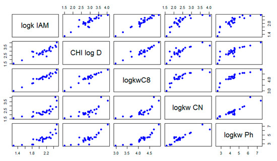 As might be expected, the obtained chromatographic indexes are generally highly correlated (Figure 1). A high correlation was noticed between IAM, C18, and C8 columns (r < 0.91). On the contrary, significantly lower correlation coefficients were achieved for the Ph and CN columns and the above-mentioned stationary phase (0.76 < r < 0.89), indicating a significant difference in the sulfonamide retention mechanism using these beds.
