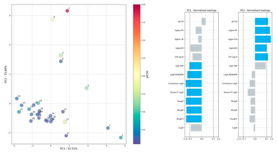 Similar results are observed on the PCA (Figure 3), where the first two PCs distinguish the parameters of computational and experimental lipophilicity. A normalized loadings plot (Figure 3) indicated that PC1 affected computational indices, whereas on PC2 it mainly affected the mainly chromatographic parameters, except IAM chromatography. Interestingly, the IAM stationary phase has a significant impact on both PCs. The surface of IAM is mostly zwitterionic at pH 7.4, and positively charged choline moieties are located in the outer part of the IAM layer. In contrast, the phosphate groups are negatively charged at the same pH and present in the phase’s inner part. This distinguishes the IAM phase from the rest tested RP-HPLC beds.