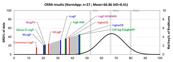 The results of the SRD analysis are presented in Figure 4. The scaled SRD values are plotted on the x-axis and left y-axis, while the right y-axis gives the cumulated relative frequencies for random ranking (black curve). The presented graph indicates the following facts: the Consensus LogP descriptor is placed closest to the reference ranking and can be considered the right choice for lipophilicity estimation of the studied series of compounds; the parameters logkwCN, CHI logDC18 and logkwPh are places furthest from the reference ranking and therefore are depicted as the least suitable lipophilicity descriptors of sulfonamide derivatives; specific groupings of the parameters can be observed; WlogP, Silicos-IT LogP and XLogP3 have very close SRD values and the same stands for logkIAM and LogP KOWWIN descriptors as well as for logkwCN, CHI logDC18 and logkwPh parameters; looking globally, there are two clearly visible gaps (gray zones in Figure 4) dividing the lipophilicity parameters into three main groups regarding the SRD values; the group consisting of in silico descriptors including Consensus LogP, WLogP, Silicos-IT LogP, XLogP3 and MLogP is closest to the reference ranking, while all the experimentally determined lipophilicity measures are placed far from the reference ranking.