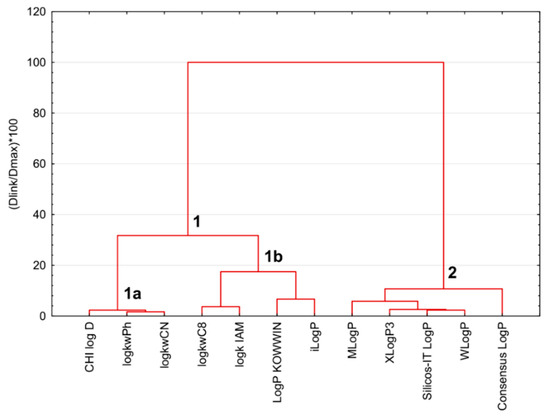 The SRD procedure was validated by 7-fold cross-validation. The results are presented in two ways in Figure 5 and Figure 6. The clustering of the experimental and in silico lipophilicity descriptors of sulfonamide derivatives in the space of the normalized SRD values (SRD%) obtained by 7-fold cross-validation is presented in the form of a dendrogram in Figure 7. Two main clusters are observable: cluster #1 contains two sub-clusters, 1a sub-cluster (CHI logDC18, logkwPh and logkwCN) and 1b (logkwC8, logkIAM, LogP KOWWIN, iLogP); cluster #2 contains MLogP, XLogP3, Silicos-IT LogP, WLogP and Consensus LogP parameters. The groupings of the parameters suggested in the SRD graph and the dendrogram comply with each other.