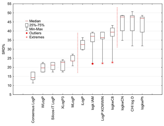Additionally, the results of the 7-fold cross-validation of the SRD procedure are presented in Figure 6 in the box and whisker plot; the parameters are arranged in the same order as in the SRD graph. The Consensus LogP parameter has the lowest median of the SRD data and is definitely depicted as the best lipophilicity parameter among the other calculated and experimentally determined parameters. There is a significant difference between the lipophilicity parameters separated by vertical dotted lines at the 5% level according to the Wilcoxon matched-pair test, which agrees with the separation of the parameters suggested in the SRD graph (Figure 5) and on the dendrogram (Figure 6). The highest median can be observed for CHI logDC18, logkwPh, and logkwCN parameters as the parameters with the highest SRD values. To conclude, the chromatographically determined lipophilicity measures do not outperform the computationally estimated lipophilicity parameters. Nevertheless, among the chromatographic lipophilicity parameters of the analyzed sulfonamide derivatives, logkIAM can be considered the best choice.