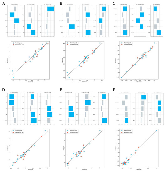 The statistical figures of the training and testing set indicated that obtained models are well fitted (R2,Q2, and RMSECV) and show suitable predictive parameters (RMSEP). Additionally, the applicability domain assessment (AD) and the y-randomization tests were performed for each model.