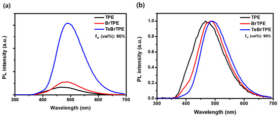 (a) Fluorescence spectra of TPE derivatives in THF (10 vol%) and water (90 vol%) solvents; (b) Normalized fluorescence spectra of TPE derivatives in THF (10 vol%) and water (90 vol%) solvents.