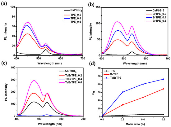 Figure 3 shows the ultraviolet–visible absorption spectra of the CsPbBr3 films containing TPE derivatives at various molar ratios. The spectrum of the bulk CsPbBr3 shows broad absorption at wavelengths less than 530 nm, and the films with TPE-derivative/CsPbBr3 molar ratios of 0.2–0.6 show a TPE absorption peak at ~315 nm. Bulk perovskite has been reported to exhibit absorption in the 430–470 nm range when transformed into a 2D low-dimensional phase by the addition of organic ligands [11,36]. However, when TPE and the Br-substituted TPE derivatives were added to CsPbBr3, a new absorption peak at 430–470 nm was not observed. The non-normalized PL spectra and the related optical properties of the CsPbBr3 films with different molar ratios of CsPbBr3 and TPE derivatives are shown in Figure 4, Figure S7, and Table 1, respectively. The spectrum of the pure CsPbBr3 film shows a weak maximum PL peak at 535 nm. When the TPE/CsPbBr3 molar ratio was increased from 0.2 to 0.6, two emission peaks were confirmed: one at 446 nm, which was the emission peak of TPE, and one at 535 nm, which was the emission peak of CsPbBr3. In the case of BrTPE, the emission peak of BrTPE was observed at 471 nm, which was redshifted by ~5 nm from that of TPE. In the case of TeBrTPE, the emission peak appeared at 476 nm, which was redshifted by ~9 nm from that of TPE. These results are attributed to enhancements in both the interaction of the TPE compound and CsPbBr3 and the grain-boundary defect passivation of CsPbBr3 with increasing number of bromides and increasing amount of the TeBrTPE derivative. Figure 4d shows a plot of the absolute PLQY ratio (I/I0) as a function of the molar ratio of TPE derivatives.