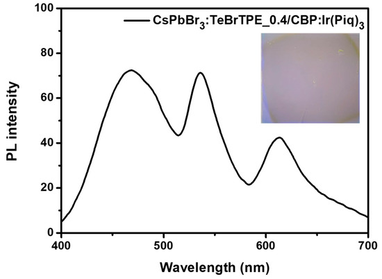To achieve ideal white-light emission on the basis of the results of the present study, we prepared a perovskite film with a TeBrTPE/CsPbBr3 molar ratio of 0.4, which had a high PLQY as well as 1:1 ratio of blue and green PL intensities. We then vacuum-deposited a red phosphorescent material, 4,4′-Bis(N-carbazolyl)-1,1′-biphenyl (CBP): 9 wt% Ir(piq)3, on top of the perovskite film with TeBrTPE (0.4 molar ratio) to achieve a thickness of 20 nm, resulting in a double emitting layer. This film exhibited three-color white PL emission with a CIE value of (0.25, 0.36) as shown in Figure 6. By applying an organic light-emitting ligand with an AIE moiety to a perovskite material, we improved the luminous efficiency of CsPbBr3, suggesting that a three-color white LED device was feasible. Further studies on a three-color white LED are underway.