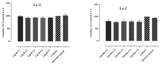 The in vitro antiproliferative potential of the L-R and L-DOX was assessed on two selected human cell lines, SK-Hep-1 (HTB-52™), derived from the ascitic fluid of a patient with adenocarcinoma of the liver, and LX-2, a human hepatic stellate cell line. The MTT assay was performed to evaluate cytotoxicity. Results were correlated with the ones obtained in the apoptosis assays. The viability and apoptosis assays showed different behavior of normal and tumoral cells exposed to the loaded liposomes. The performed analysis indicated relevant in vitro cytotoxic activity for all tested samples as well as differences related to doses and cell lines. The obtained results are presented in Figure 1 and Figure 2.