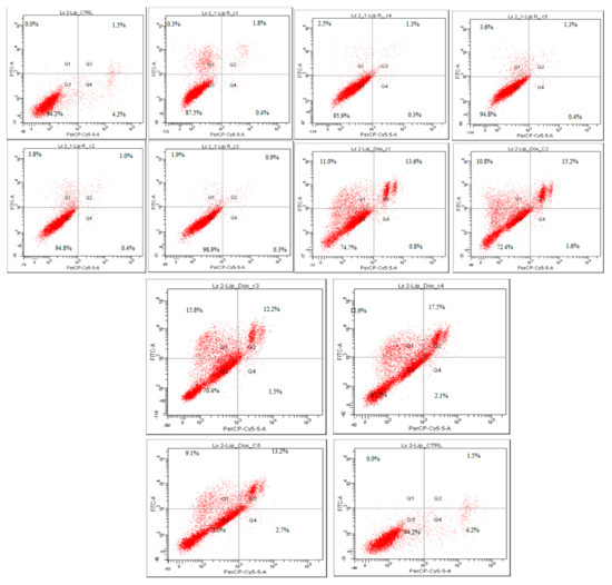 Apoptosis evaluation in LX2 cells (10,000 events) after treatment with L-R and L-DOX. After 24 h of treatment, the cells were stained with Annexin V-FITC and Ethidium Homodimer III (EthD-III) and were evaluated using the BD FACS Canto II flow cytometer (Becton Dickinson, Franklin Lakes, NJ, USA) using the BD FACSDiva 6.1.2 software. The results are shown in dot plots divided into 4 quadrants: Q3—viable cells (Annexin V-FITC (−), EthD-III (−)), Q1—early apoptotic cells (Annexin V-FITC (+), EthD-III (−)), Q2—late apoptotic (Annexin V-FITC (+), EthD-III (+)), and Q4—necrotic cells (Annexin V-FITC (−), EthD-III (+)).