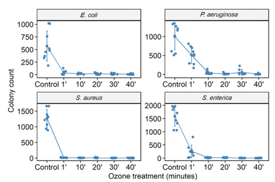 The number of colony-forming units (CFU) in different bacterial strains (S. aureus (ATCC 6538), P. aeruginosa (ATCC 15442), S. enterica (ATCC 10708), and E. coli (ATCC 25922)) was counted. CFU counting was performed in the control group (no treatment) and bacterial suspensions (105 CFU/mL) after exposure to ozone for 1, 10, 20, 30, and 40 min.