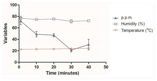 Monitoring the O3 concentration inside each container showed that the average ozone emission from the equipment (1 to 40 min) ranged from 21.1 ppm to 71.7 ppm, with the average of all measurements being 43.9 ppm (Figure 1). The mean ozone concentration in the 40 min time chosen for testing with the MDR strains was 30.8 ppm (Figure 2). The ambient temperature ranged from 22.5 °C to 24.3 °C, with an average of 23.4 °C. Regarding the relative humidity of the air, it went from 71.4% RH to 75.5% RH, with an average of 74.2% RH (Table 1, Figure 2).